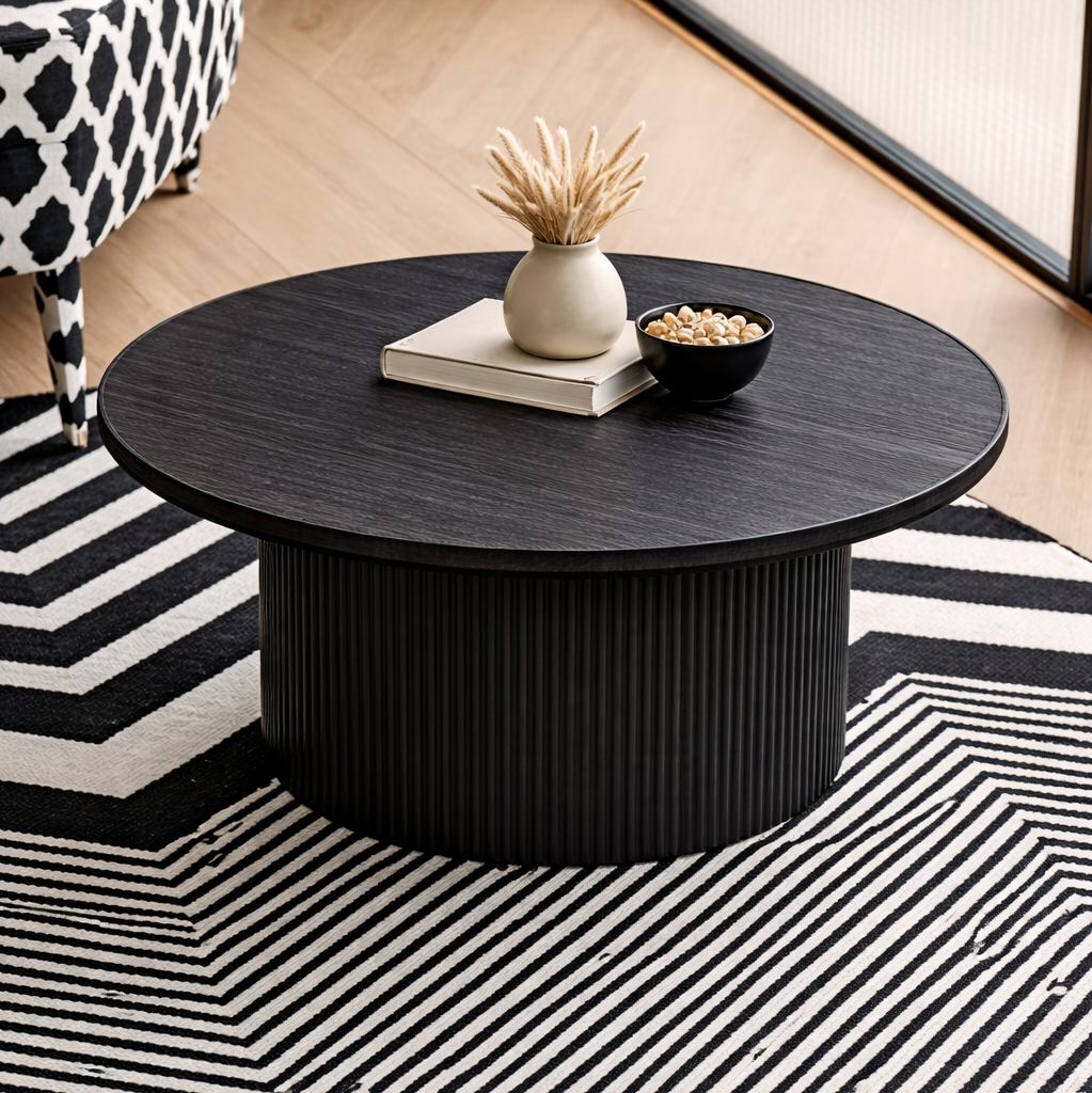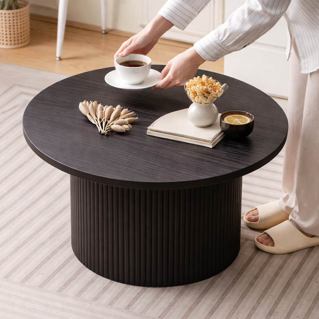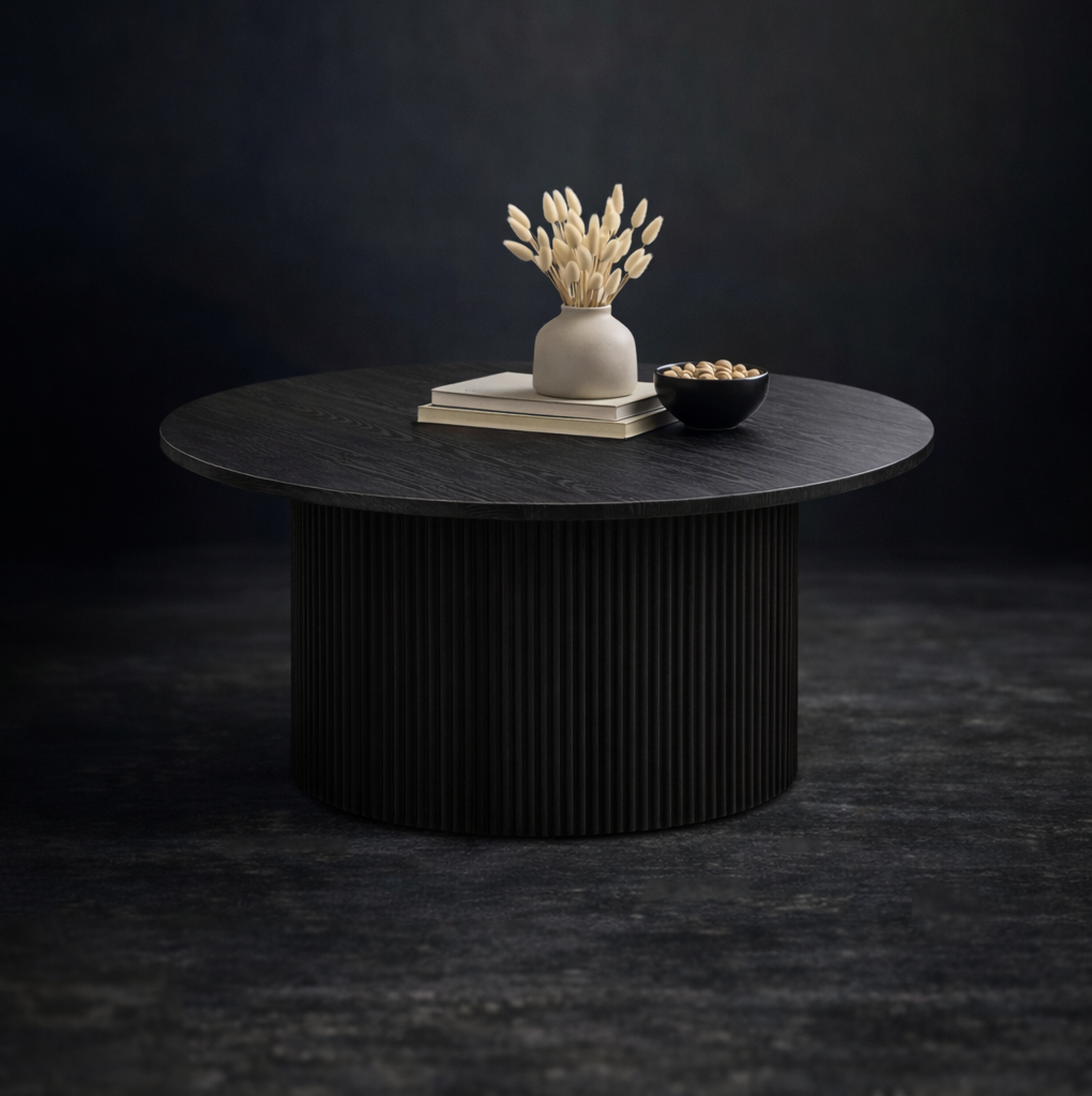 Une table basse ronde avec un piètement cannelé et une finition chêne foncé profond. Lignes épurées, aspect apaisant—conçue pour ancrer l’espace de repos sans alourdir.
